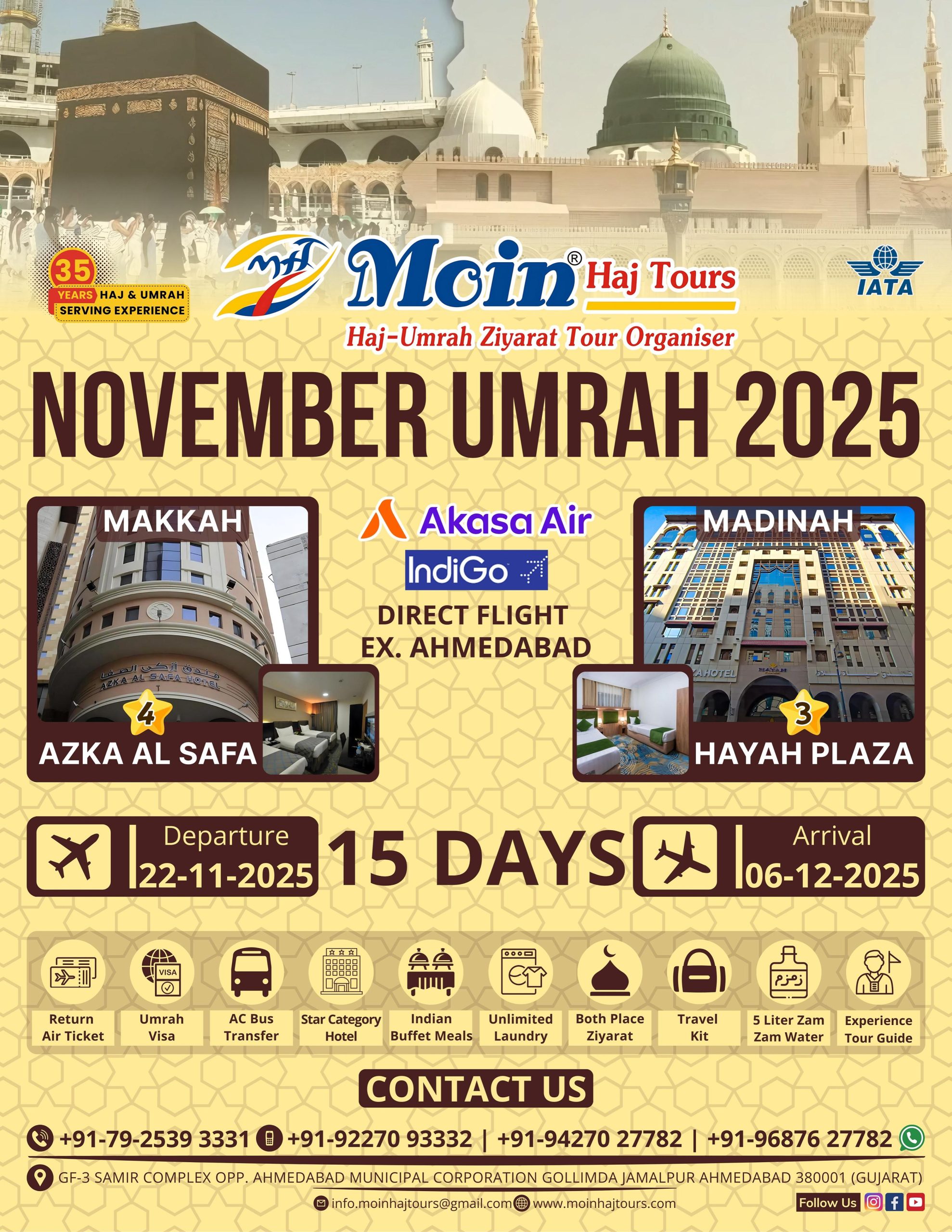 Moin Haj Tours Our Packages Umrah Package Perfect for those seeking a blessed journey to Makkah and Madinah with expert guidance and comfortable arrangements. View Package Ramadan Umrah Package Experience the spiritual essence of Ramadan in the holy cities with our specially designed Umrah packages for the holy month. View Package Hajj Package Comprehensive Hajj tours with complete support in rituals, travel, and accommodation – ensuring a stress-free and spiritual pilgrimage. View Package Ziyarat Package Visit the sacred Islamic heritage sites and enrich your faith with guided Ziyarat tours.